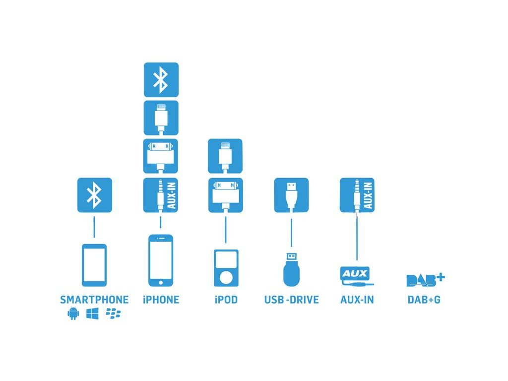 - Vstup pre iPod/iPhone s nabíjaním 1A (kábel na pripojenie iPod/iPhone nie je súčasťou balenia)