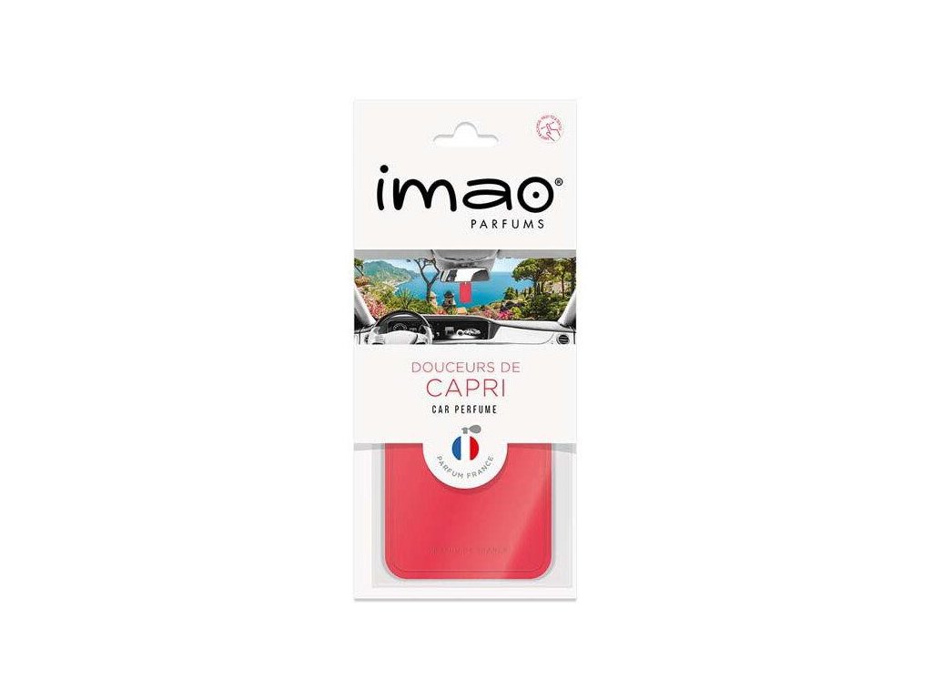 IMAO parfumy sú novinkou francúzskych odborníkov na parfumy iDscent z oblasti Grasse, ktorá je svetovou jednotkou vo výchove parfumérskych velikánov. IMAO Parfum disponuje niekoľkými exotickými vôňami, ktoré vás očaria tak, že nebudete chcieť vystúpiť z auta. Je nepopierateľné, že svetovou jednotkou vo výrobe parfumov je práve Francúzsko, preto stavte na istotu a kúpte si iDscent Scentway. IMAO parfum v krásnom dizajnovom vyhotovení je vložený do živicovej visačky so zaoblenými rohmi a so stuhou na jednoduché umiestnenie kamkoľvek (auto, dom, skriňa, dielňa). Použitá guma je inovovaná, vďaka čomu má lepšiu schopnosti nasať a postupne uvoľňovať aromatické látky ako klasické závesné osviežovače. Vôňa Capri očarí vaše zmysly a získa si vás dokonale prepracovanou vôňou.