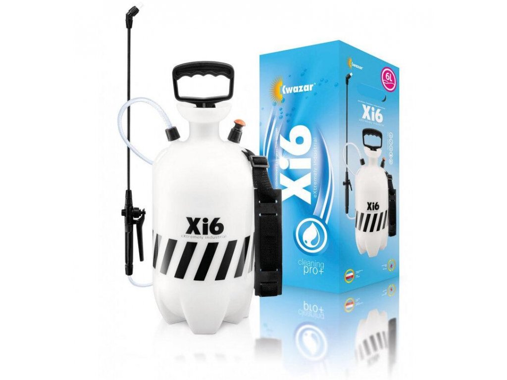 Kwazar Cleaning Pro+ XI 6L ručný tlakový postrekovač 6000 ml: ručný tlakový postrekovač s chemickou odolnosťou. Extremely Industrial - Xi6 je lacnejšou napodobeninou napeňovača Orion Pro. Hoci sú si svojimi funkciami veľmi podobné, cenu ovplyvňuje najmä odlišný a lacnejší model kontajnera. Má tiež bezpečnostný ventil, ktorý chráni tlak v nádobe pred zvýšením. Tryska je nastaviteľná a je možné zvoliť objem postreku. Tento rozprašovač má tesnenie Viton, ktoré je odolné voči chemicky agresívnym látkam. Ramenný popruh uľahčuje prenášanie a manipuláciu. Jeho skladanie je veľmi jednoduché, a preto na výmenu tesnenia alebo údržbu nie sú potrebné žiadne nástroje.