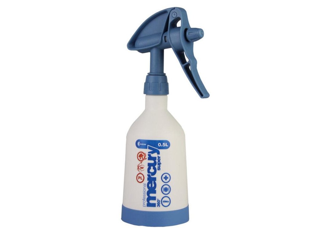 Kwazar Mercury Super Pro+ 360 V-0.5 BLUE dvojčinný postrekovač modrý. Miešacia fľaša s obsahom 500 ml, dvojčinný postrekovač a systém 360 stupňov. Mercury Super Pro+ Je to šikovný pomocník na prácu na malých alebo stredne veľkých plochách, ako je napríklad práve automobilový priemysel. 360° postrekovač využíva silikónovú nasávaciu trubicu a filter na potlačenie kvapalín, vďaka čomu je postrekovač funkčný v akejkoľvek polohe a dokáže pracovať aj s minimálnym množstvom roztoku v nádrži. Je vhodný na prácu v detailingových salónoch, autoservisoch alebo na domáce práce.