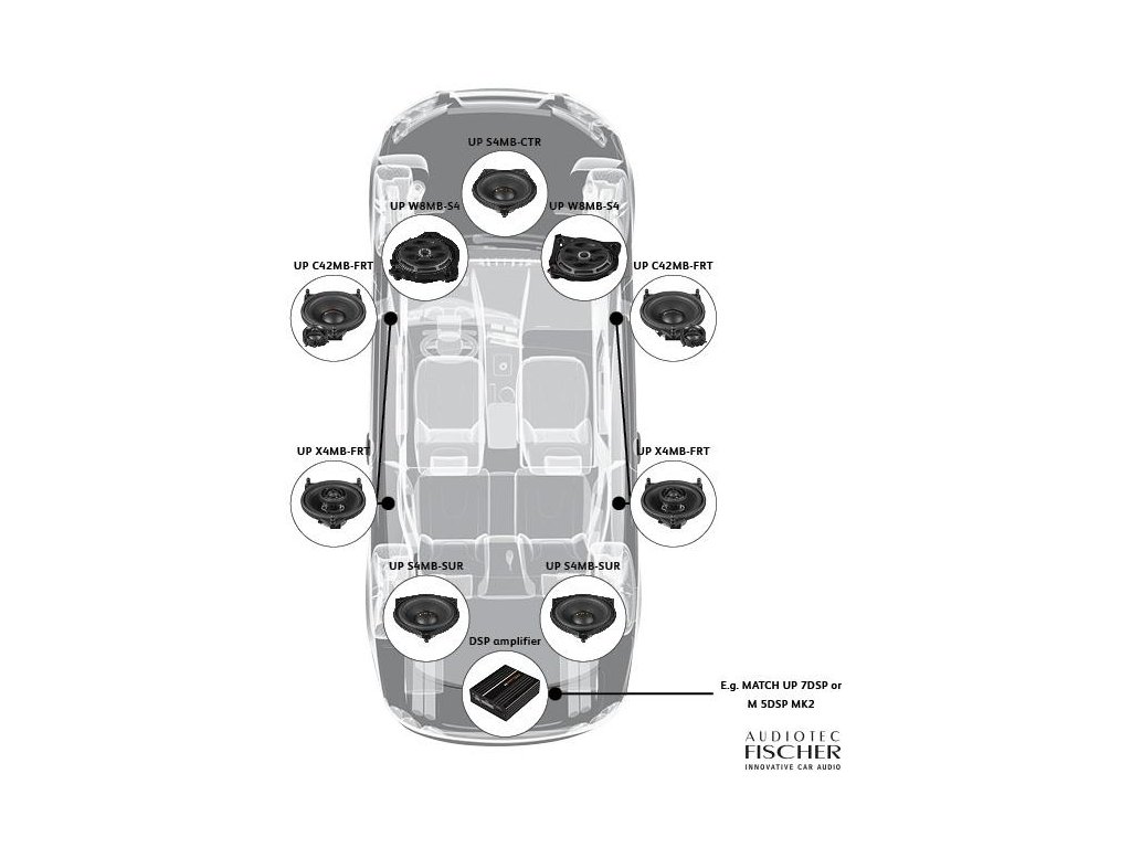 Prémiové autá si zaslúžia prvotriedny zvuk – základný audiosystém vo vozidlách Mercedes-Benz v mnohých prípadoch nespĺňa očakávania ambicióznych milovníkov hudby ba ani menej náročných poslucháčov. Match prichádza s kompletným riešením reproduktorov perfektne ušitým na mieru vozidlám Mercedes-Benz . Nič nebolo ponechané na náhodu a nemecký vývoj, ktorý trval viac ako 2 roky šiel svojou vlastnou cestou. Nebolo tak iba kopírované to, čo majú ostatné značky. Pridanou hodnotou je plná kompatibilita so zosilňovačmi Match M5 DSP MKII, Match UP8DSP a Match UP10DSP . S nimi potom dokážu naplno odhaliť svoj dynamický potenciál.
