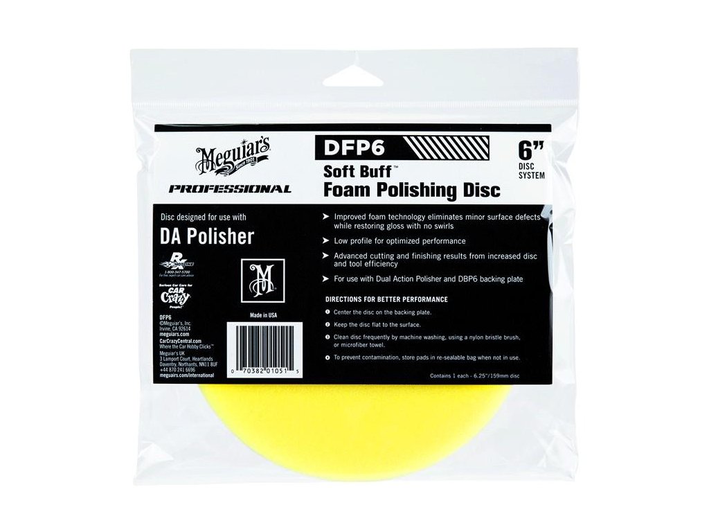 Novo vyvinuté penové kotúče na dosiahnutie najdokonalejších výsledkov pri obnove a leštení laku. Kotúč DFP6 má viacero možností použitia. Plne nahradil predchádzajúci kotúč W8207, ktorý patrí do série Soft Buff 2.0. Kotúč DFP6 je tvrdý kotúč určený na obnovu laku pomocou abrazívnych lešteniek. Sú vyvinuté na prácu s leštičkou DA a zaručujú dokonalý finiš. Ich nové zloženie peny zabezpečuje minimálne zahrievanie pri práci, a tým eliminuje riziko spálenia laku. Jednoduchá manipulácia a dokonalý povrch pri brúsení a leštení laku. Nové a mimoriadne silné suché zipsy Velcro spájajú kefu a brúsny kotúč tou najsilnejšou silou. Táto možnosť udržuje účinnosť leštenia na vysokej úrovni, neznižuje jeho účinnosť a nehrozí strata brúsneho kotúča. Bežné suché zipsy nie sú také pevné a nedržia brúsny kotúč na mieste, čím sa stráca sila brúsenia a niekedy aj celý kotúč. Suché zipsy Velcro sú pevné a zaručujú dokonalé uchopenie. Vďaka tomu ide práca takmer sama a nehrozí žiadne riziko zníženia sily, ktorú leštička vytvára, a všetka vytvorená sila ide do laku vozidla. Spoločnosť Merguiar's používa suchý zips na diskoch a krytoch kolies všetkých typov a veľkostí. Kotúče DFC sú vyvinuté v spolupráci s najlepšími svetovými detailérmi tak, aby spĺňali najprísnejšie kritériá pri obnove a leštení laku, pričom najpoužívanejšie sú veľkosti 5 a 6 s minimálnou hrúbkou 17,5 mm. Ich malá hrúbka zaručuje skvelú spoluprácu a možno ich nazvať disky.