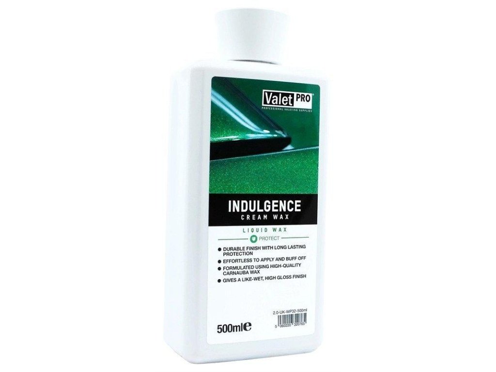 Valetpro Indulgence Cream Wax je krémový vosk, který byl speciálně vyvinut tak, aby dosahoval vysokého lesku a zároveň se velmi snadno aplikoval. Na rozdíl od ostatních vosků má tu výhodu, že může být aplikován a stírán prakticky okamžitě po aplikaci. Obsahuje v sobě pravou karnaubu, proto za sebou zanechává opravdu vysoký lesk.