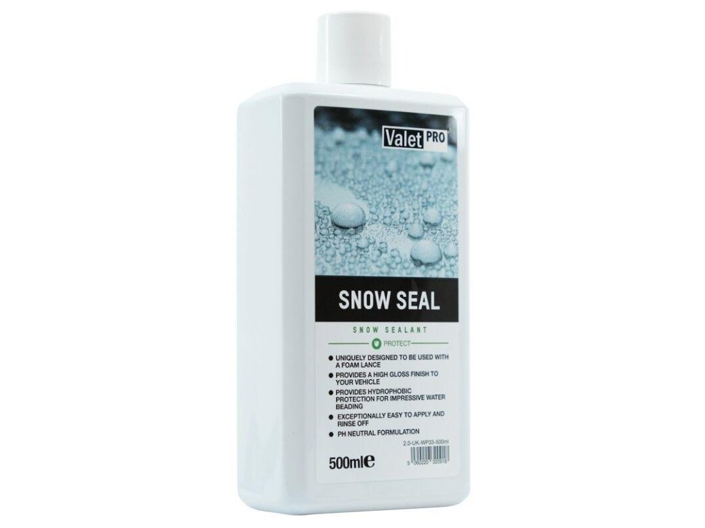 ValetPro Snow Seal je špeciálne vyvinutý povlak, ktorý sa nanáša pomocou tlakovej penovej dýzy a vášmu automobilu zaistí odolný hydrofóbny povlak – ten povedie k tzv. „korálkovaniu“ vody. Aplikácia prípravku je veľmi ľahká, jednoducho sa nastrieka na čisté vozidlo, opláchne a osuší. Tento proces zaručí, že na vašom vozidle zostane pôsobivý lesklý povrch, ktorý nie je potrebné vytvrdzovať – nanášať ďalšie voskové vrstvy.